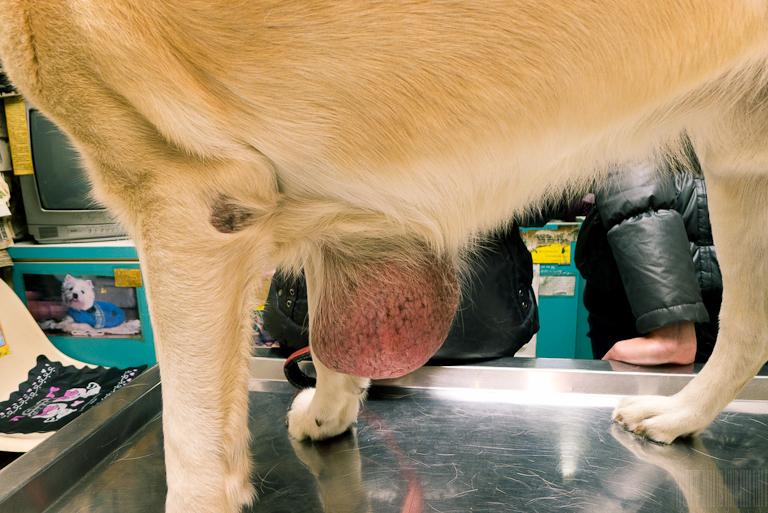 比較特別的是有一隻黃金,他身上長了三顆腫瘤,其中兩顆比拳頭還大,另外一顆在脖子上,比較小一點。這隻黃金大概七歲,不過為什麼會長出這麼大顆的腫瘤,似乎是有點拖太久來就醫了。