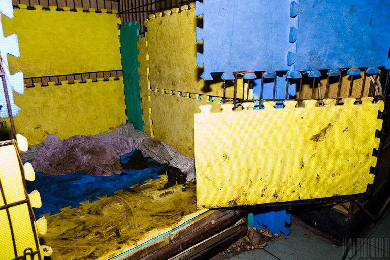 嗯,再來就要讓大家看一下噁心的畫面。大家都知道小Lucky是一隻有問題的狗,而因為目前沒有辦法二十四小時照顧他,因此他晚上都是睡在這個由泡綿所包覆的一個大籠子裡面,因為不可能放小Lucky四處亂跑,他不知道會幹出啥事,例如可能亂咬東西或卡在某處或是到處亂尿亂大便,甚至造成危險。