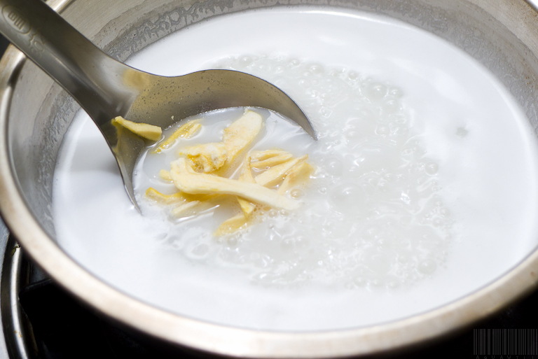 接著就用小火把椰奶煮滾,到稍微有點稠稠的程度就可以了,大概十分鐘。