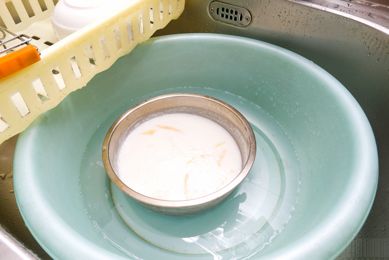 放到冷水之中冷卻增加些許彈性,如果有冰塊的話更好,不過因為家裡沒有所以只能用冷水。